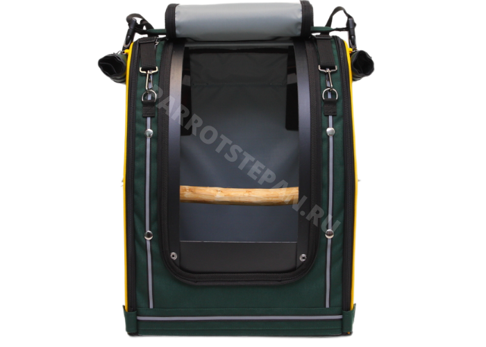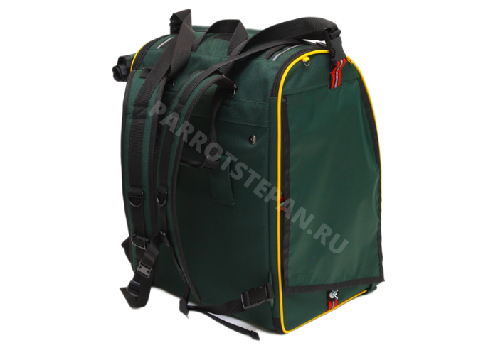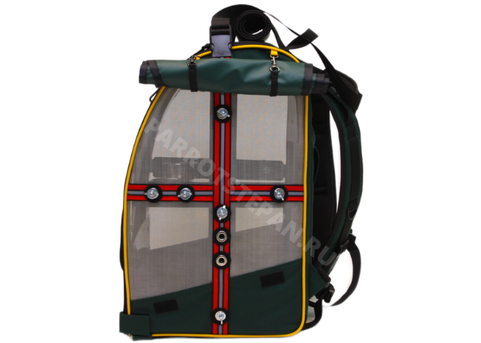 Рюкзак-переноска в цветовой гамме попугая амазон, боковые стенки из сетки нержавейки.